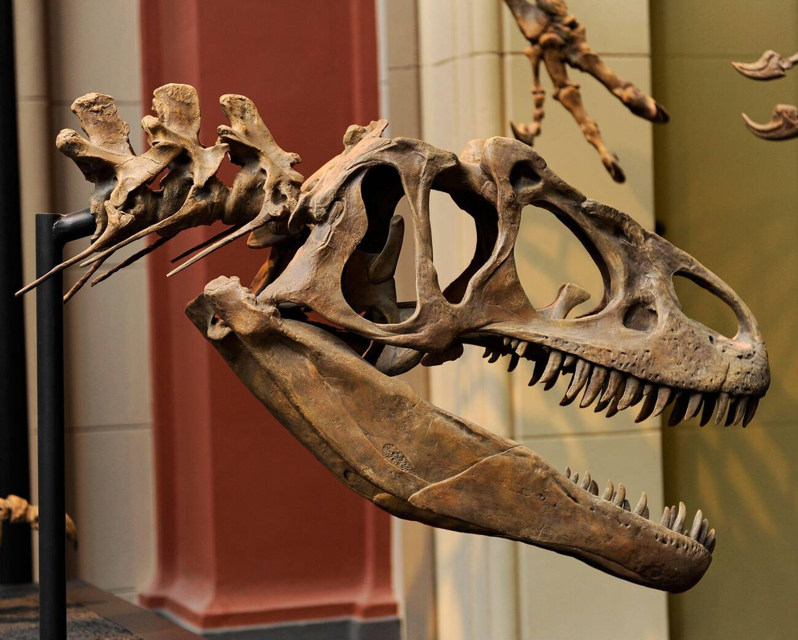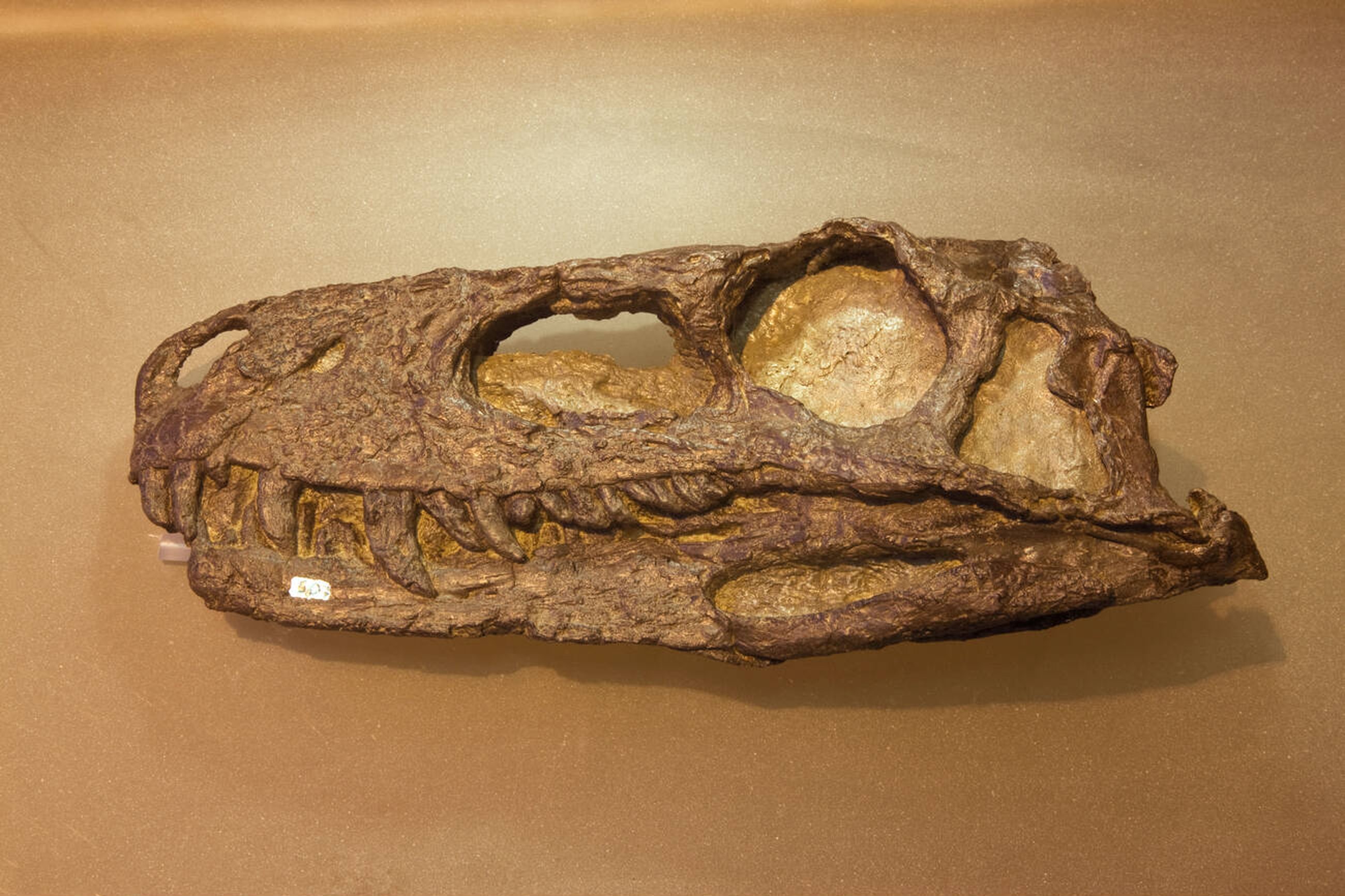 En la foto observamos un cráneo perteneciente al género de dinosaurio temprano Herrerasaurus. Los dinosaurios se originaron en el período Triásico, aunque aún se discute específicamente en qué parte del mismo. Por ahora, parece que la evidencia apunta a finales del Triásico medio o principios del Triásico tardío, hace entre 245 y 230 millones de años. Los fósiles más antiguos de dinosaurios provienen de Gondwana, la masa terrestre al sur del supercontinente Pangea. Son destacables los hallazgos en Sudamérica, particularmente en lo que hoy es Argentina y sur de Brasil.
